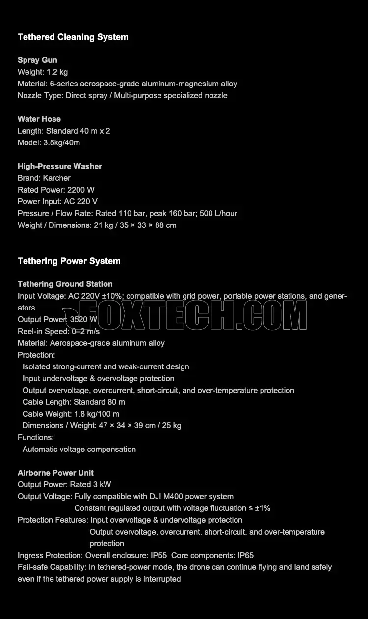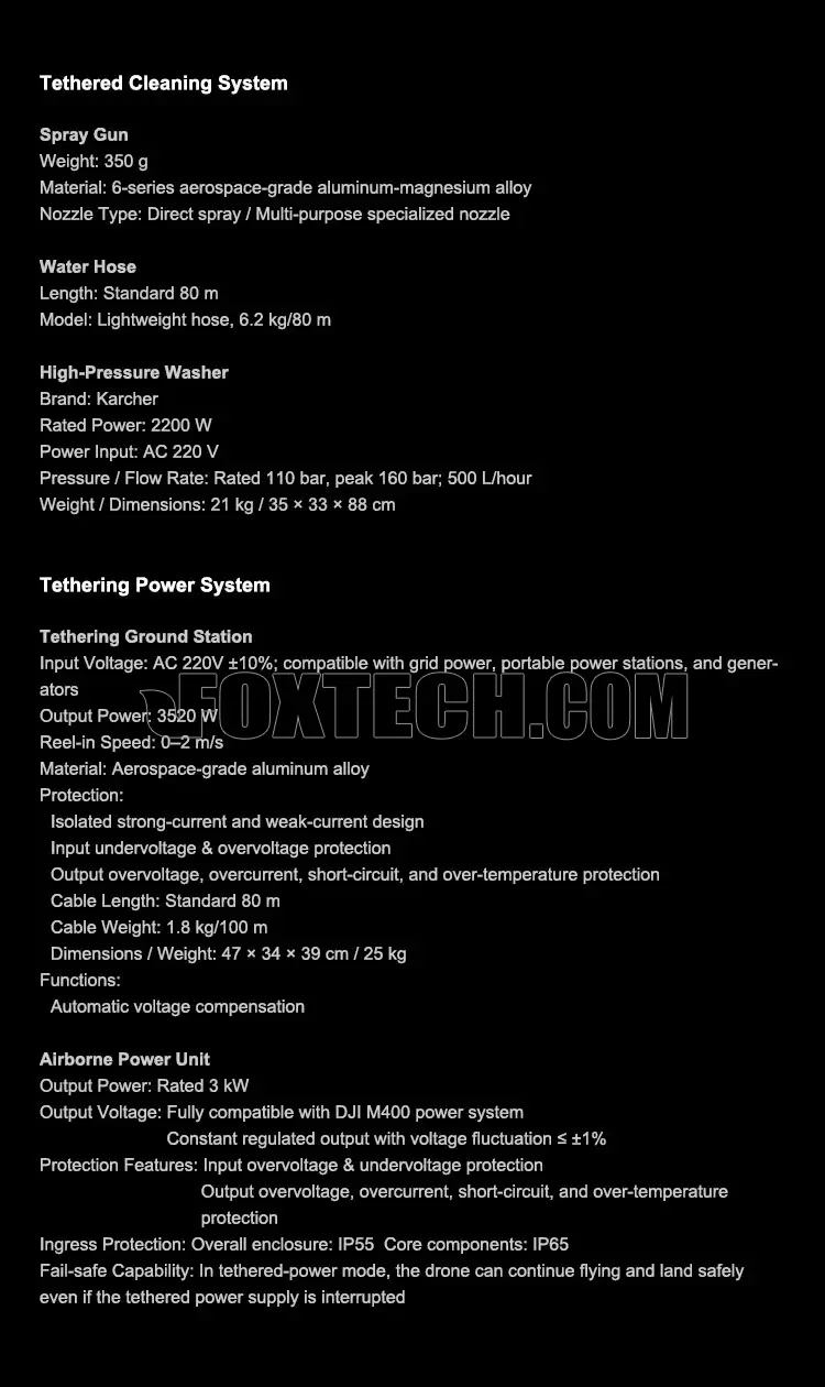 Its airborne 3kW power unit with ±1% voltage stability and IP55/65 protection ensures safe, reliable operation even in long-duration missions, while the ground tethering station with 3520 W output, smart Bluetooth monitoring, and remote device management provides complete operational control.