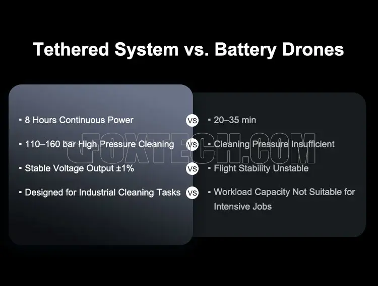 - Continuous Power for 8 Hours – Enables extended cleaning missions with uninterrupted tethered power.