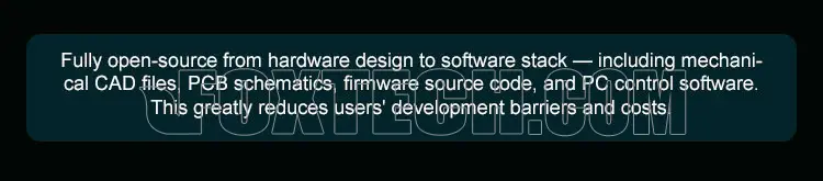 Fully open-source from hardware design to software stack — including mechanical CAD files, PCB schematics, firmware source code, and PC control software. This greatly reduces users' development barriers and costs.