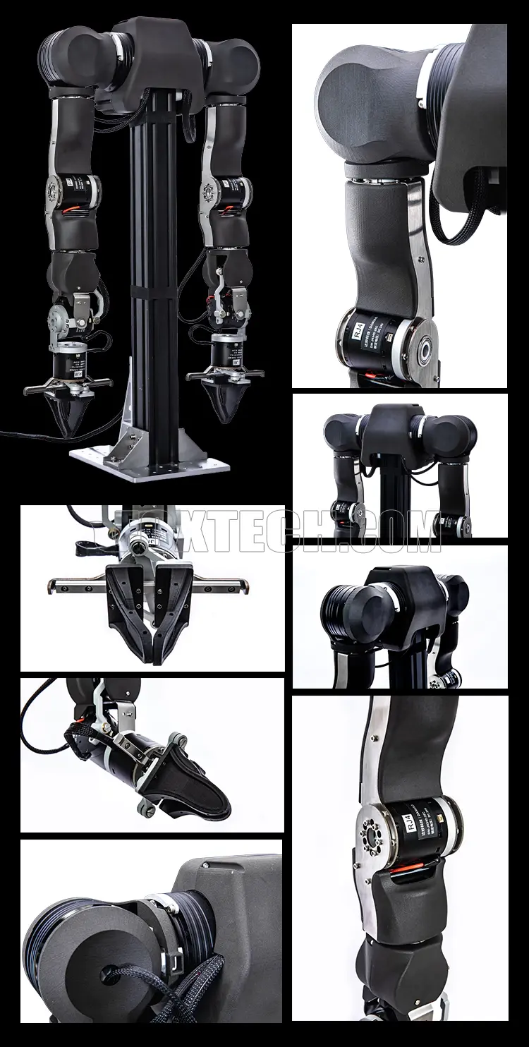 This wearable exoskeleton system employs drive-by-wire technology, enabling operators to control robotic arms in real time by mimicking human arm movements. Once worn, every movement of the user is precisely mapped to the robotic arm, allowing for natural, intuitive, and efficient control through an electronic signal-based system.