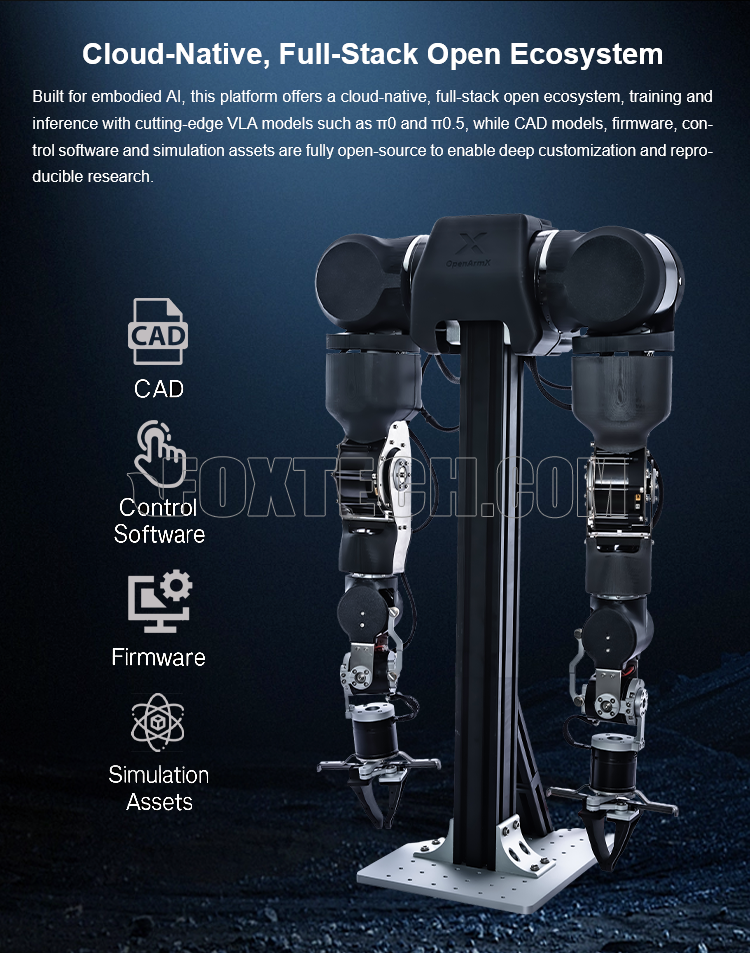 The robot ships with an integrated industrial PC and a complete software stack. Ubuntu 22.04 with ROS2 Humble is pre-installed, together with an OpenArmX SDK that includes:
