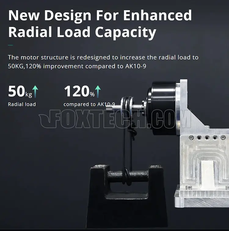 The CubeMars AKA series is engineered for applications with high radial loads, including wheeled robots and AGVs. Featuring a groundbreaking structural design, the AKA series delivers a 120% increase in radial load capacity compared to the AK10-9 under the same torque conditions, significantly extending the lifespan of the module.