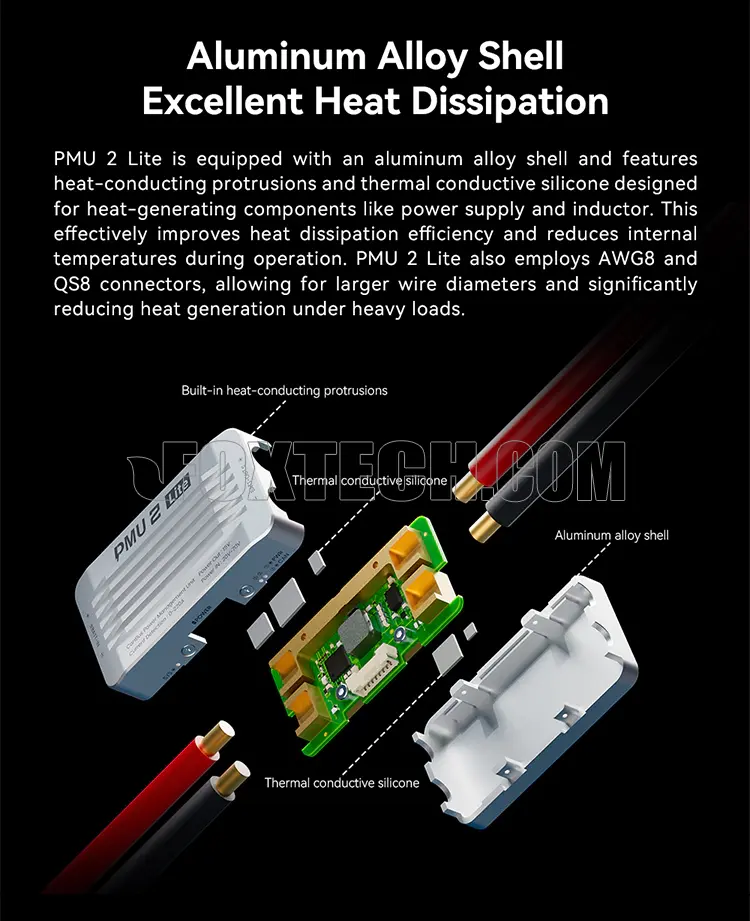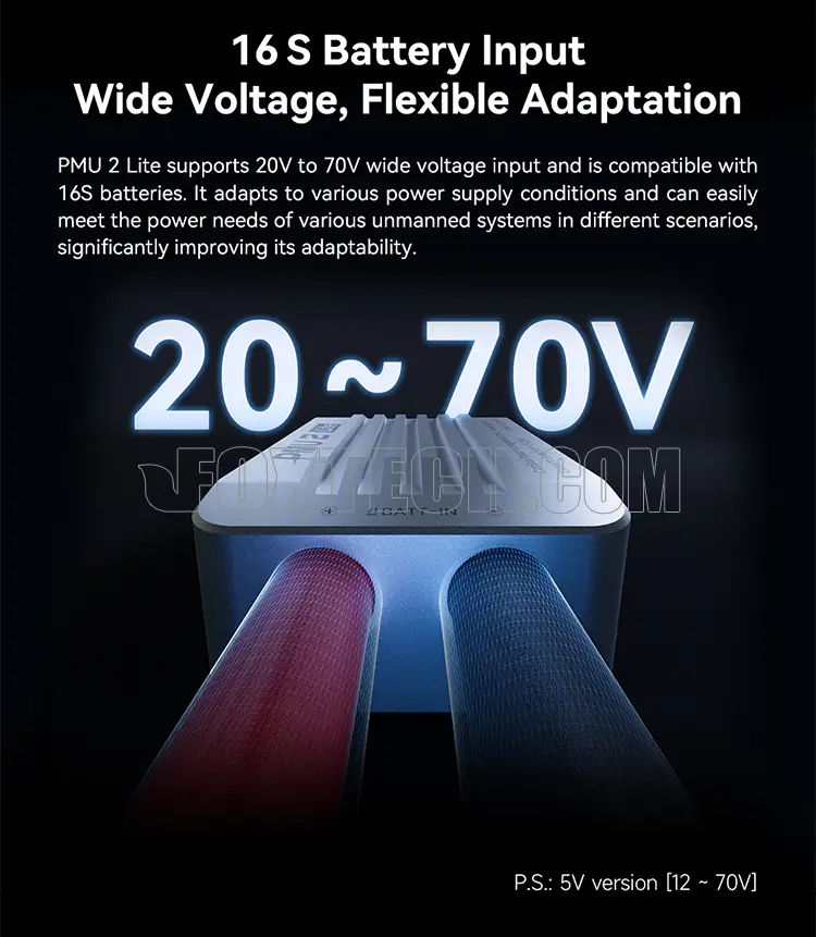 PMU 2 Lite Power Manager Unit is a high-precision power management module designed for UAVs and unmanned systems, featuring 220A high-current detection and 20V–70V wide voltage input compatible with 16S batteries.