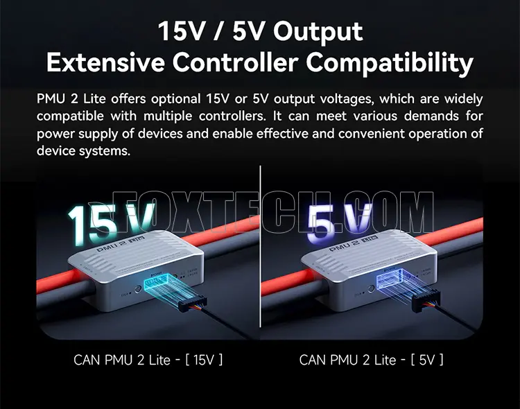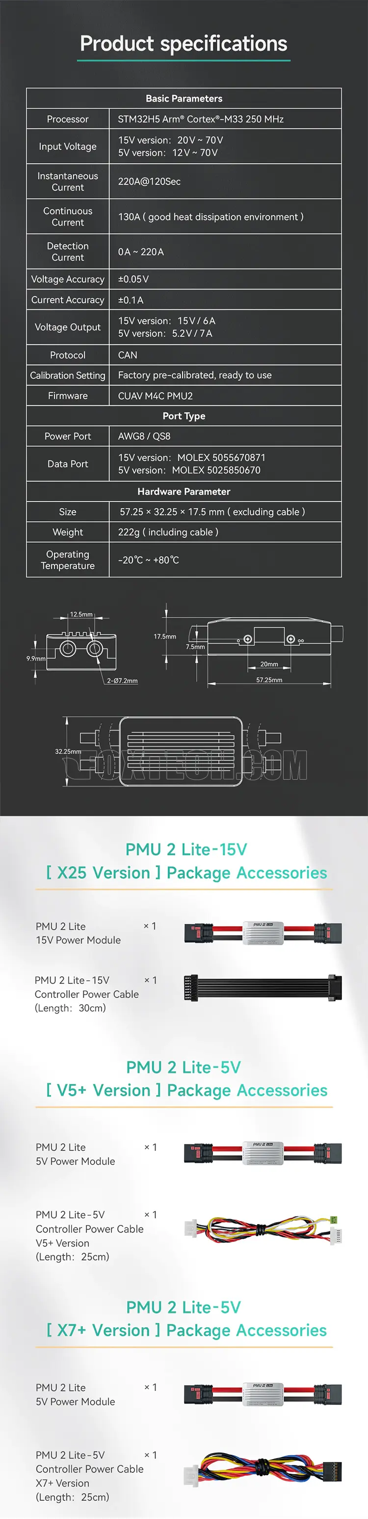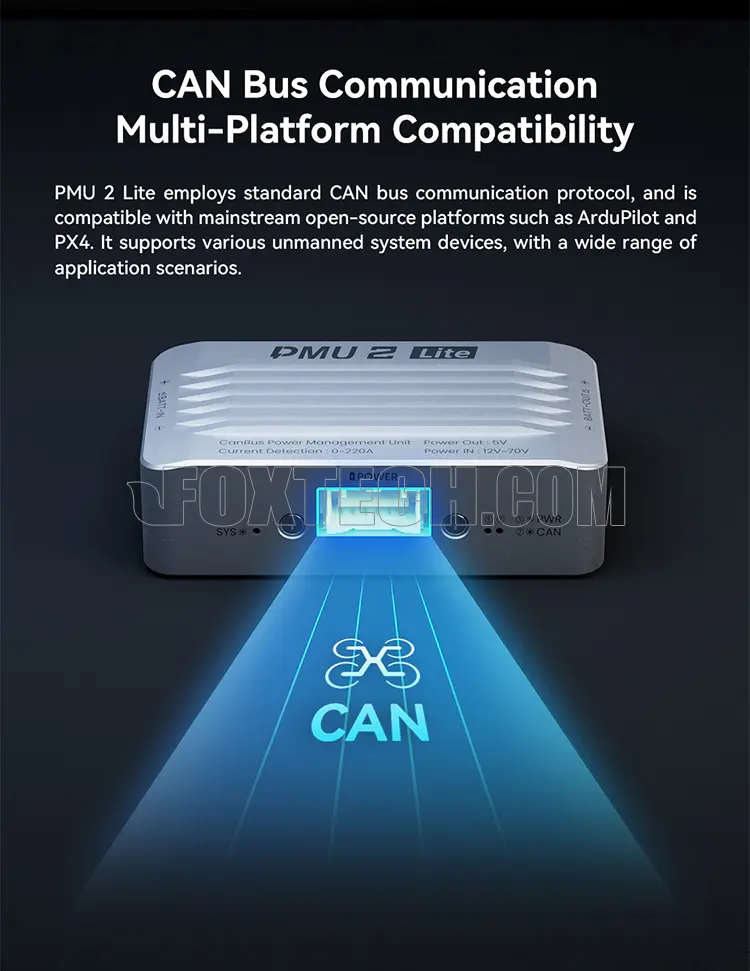 It adopts non-contact, coreless busbar current sensing technology and runs on a self-developed M4C architecture powered by an STM32H5 Cortex-M33 processor (250MHz). With the ITT3 temperature impedance tracking algorithm, PMU 2 Lite delivers outstanding measurement accuracy of ±0.05V / ±0.1A across wide temperature and load ranges. Factory pre-calibrated for plug-and-play use, it supports DroneCAN / CAN bus communication, offers 5V or 15V regulated outputs, and features an aluminum alloy housing for efficient heat dissipation, making it an ideal UAV power management unit for ArduPilot and PX4 platforms.