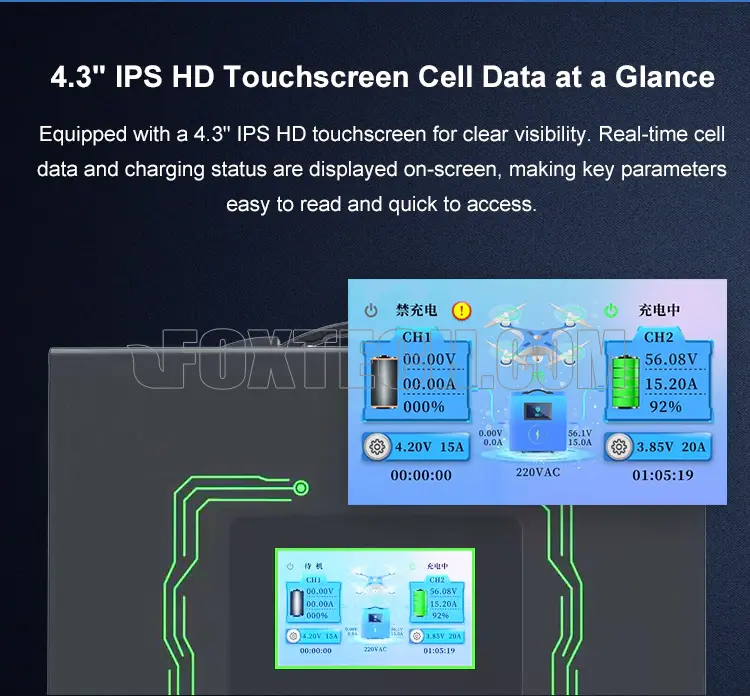 4.3" IPS HD touchscreen, real-time cell monitoring for clear visibility
