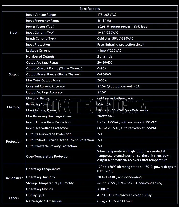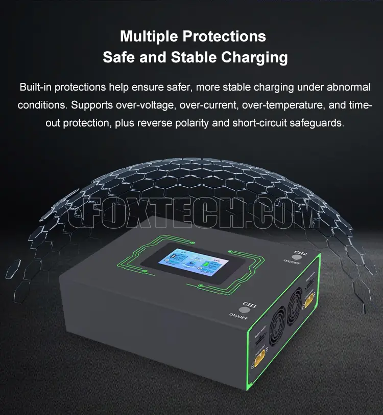 The D14 Smart Balance Charger is designed for professional charging and maintenance of 6–14S lithium battery packs. It features dual outputs with flexible current/voltage adjustment, and a 4.3" IPS HD touchscreen for real-time cell data monitoring. Built-in multiple protection functions enhance safety and reliability for testing, maintenance, and industrial use cases.