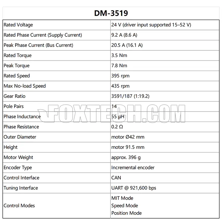 The DM-S3519 is a compact 42 mm BLDC planetary gear motor with an integrated driver and incremental encoder. It runs at a 24 V rated voltage (driver input 15–52 V supported) and delivers 3.5 Nm rated torque (7.8 Nm peak) with a rated speed of 395 rpm (max no-load 435 rpm). The controller supports MIT / Speed / Position modes, offers CAN bus control with UART (921,600 bps) for configuration, and includes comprehensive protections for safe, reliable operation. With a 1:19.2 planetary reduction, Ø42 mm diameter, 91.5 mm height and about 396 g weight, it fits tight spaces while providing high output torque.