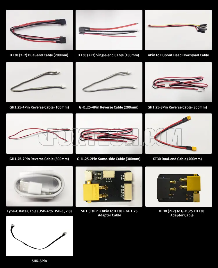 It includes XT30, GH1.25, SH1.0, and Type-C interfaces with various lengths and configurations to meet different installation and debugging needs.