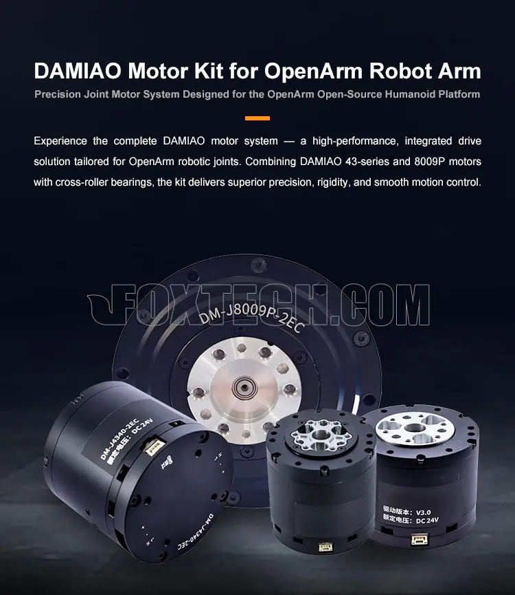 The DAMIAO Joint Motor System is a comprehensive motor drive solution designed specifically for the OpenArm open-source humanoid robot arm. It combines the power of DAMIAO 43-series and 8009P motors, meticulously selected for each joint, from the shoulder to the end-effector, to provide optimal torque, speed, and stability for robotic applications.