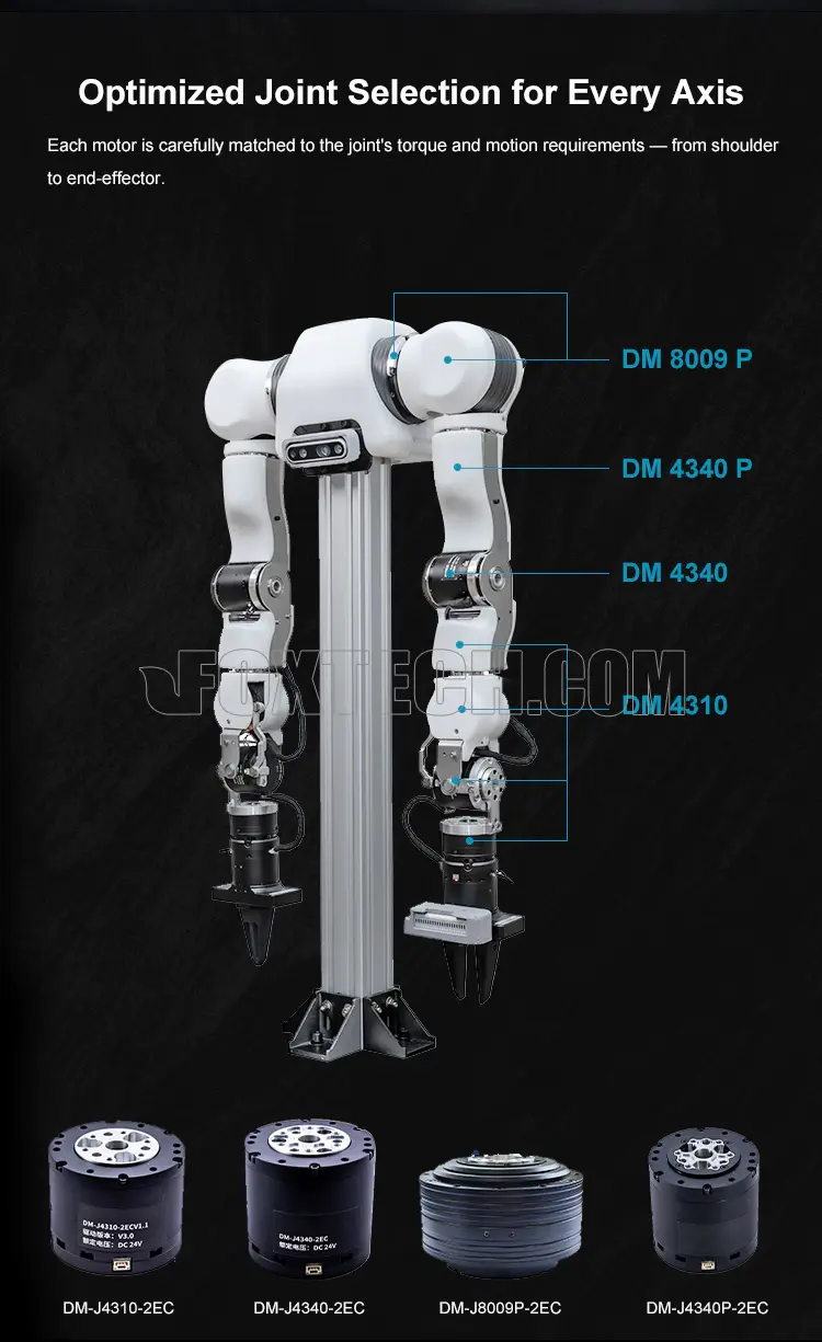 Equipped with high-precision cross-roller bearings, the system ensures exceptional rigidity and positional accuracy, especially in single-side-supported sections. The DAMIAO 4340 series motors further enhance performance, offering a high payload capacity in a compact, lightweight design—perfect for robotics research, development, and advanced robotic applications.