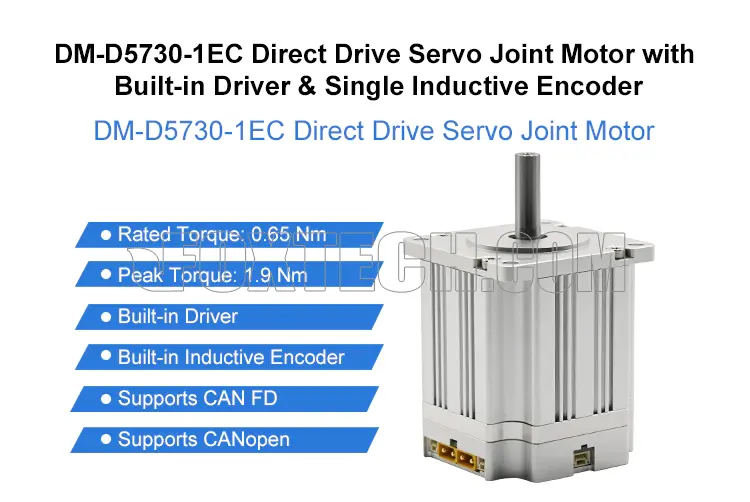 The DM-D5730-1EC is a compact direct drive servo joint motor integrating a motor, driver, and single high-precision inductive encoder into one unit.