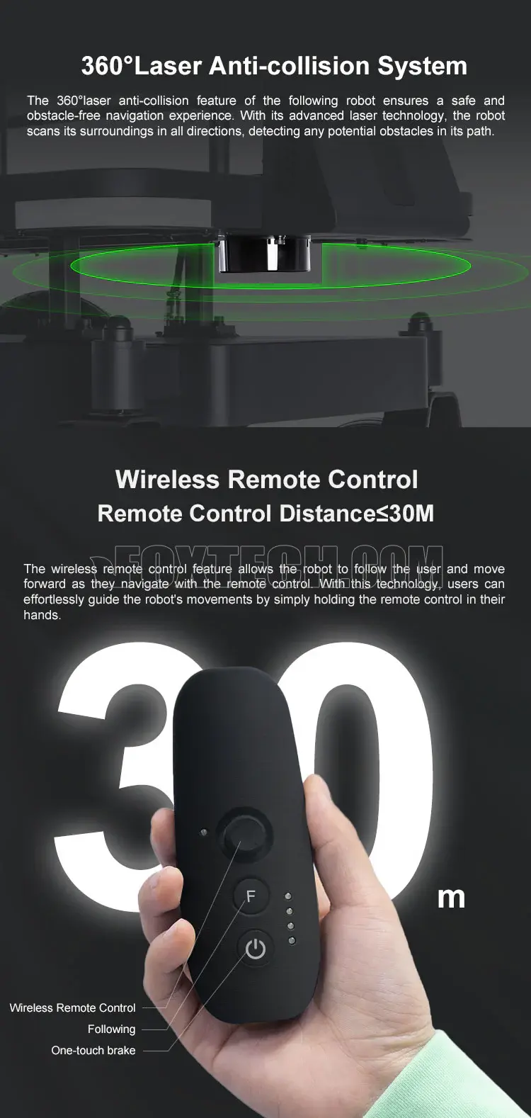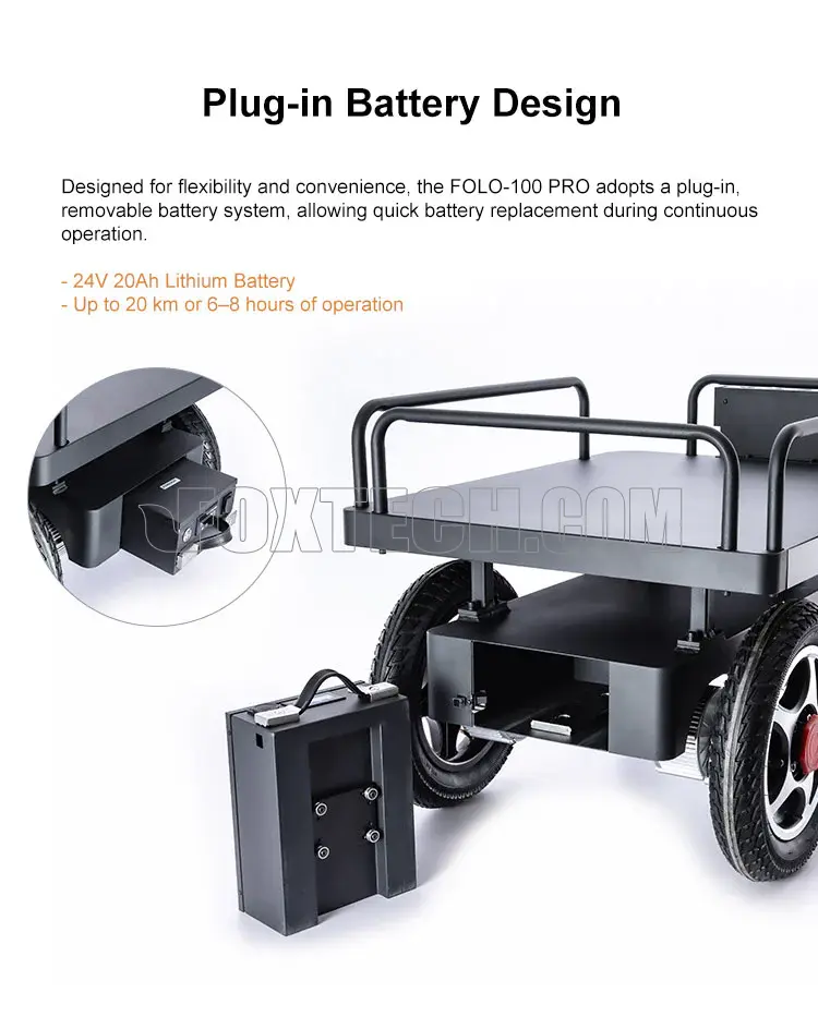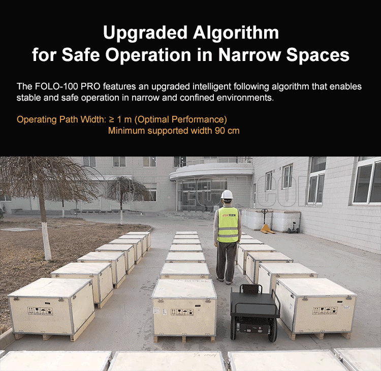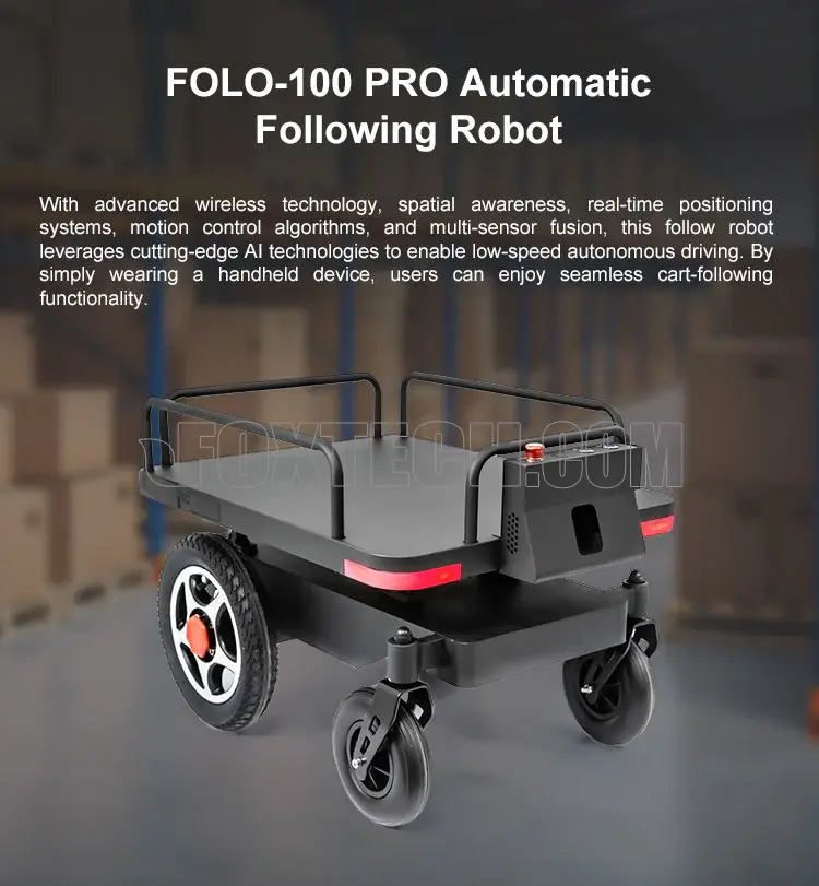 By integrating wireless communication, spatial perception, real-time positioning, motion control algorithms, and multi-sensor fusion AI technology, the FOLO-100 PRO enables reliable low-speed autonomous operation. When paired with a handheld device, the trolley can accurately follow the user, significantly reducing manual handling effort and improving operational efficiency.