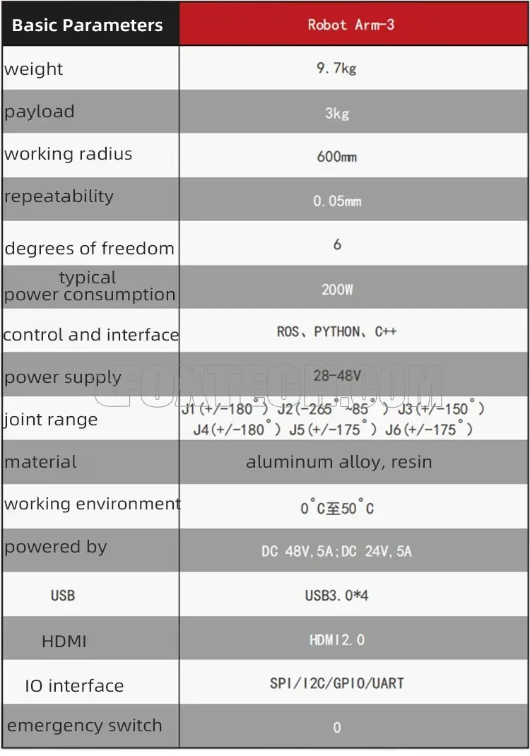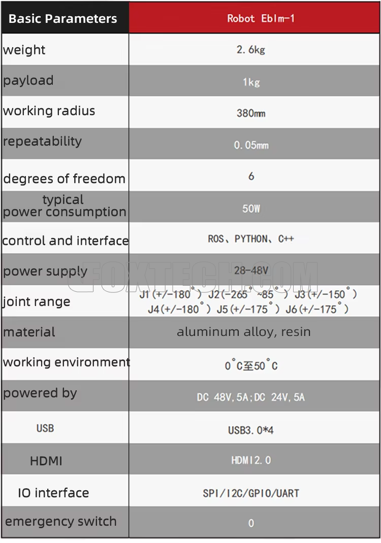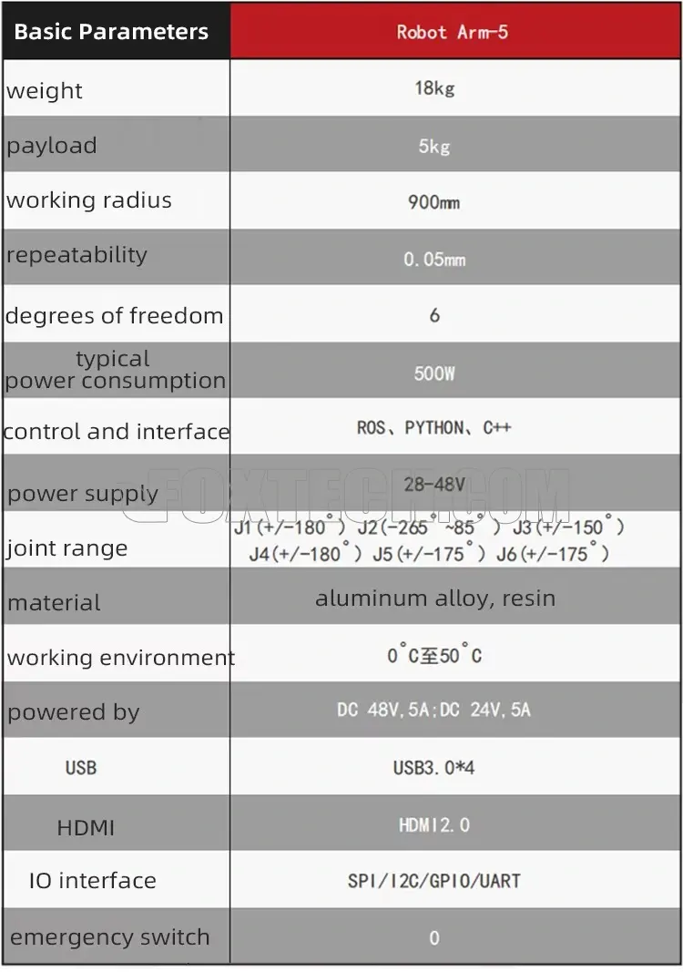 All variants share wide joint limits for flexible poses in tight spaces—J1 ±180°, J2 −265°~+85°, J3 ±150°, J4 ±180°, J5 ±175°, J6 ±175°—and operate at 0–50 °C with a durable aluminum-alloy + resin structure. Integration is straightforward: the controller provides USB 3.0 × 4, HDMI 2.0, and SPI/I²C/GPIO/UART I/O for peripherals and vision systems. An emergency stop is not included by default and can be added per project and risk assessment.