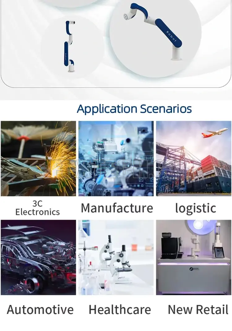 Engineered for dependable human–robot collaboration, this 6-axis cobot series delivers 0.05 mm repeatability with DC 28–48 V input, making it easy to deploy on benches, fixed cells, or AGV/AMR platforms. Rounded, compact joints and a flange-mount base enable dense layouts, while flow-style programming with ROS, Python, and C++ shortens commissioning for pick-and-place, loading/unloading, inspection, sorting, screw-driving, and dispensing across 3C electronics, manufacturing, warehousing & logistics, automotive parts, healthcare labs, and new-retail demos.