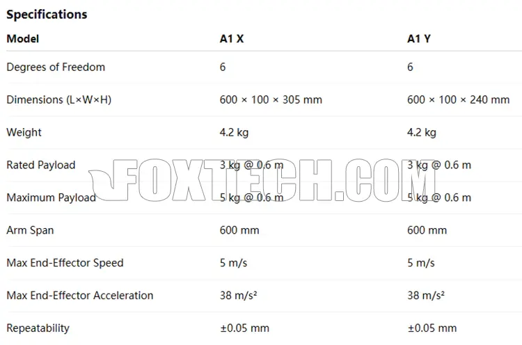 Lightweight & Powerful – Only 4.2 kg arm weight with up to 5 kg maximum payload (3 kg continuous at 0.6 m reach).