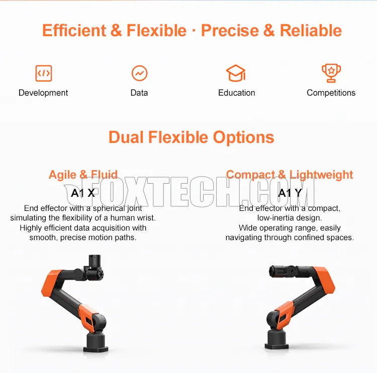 Compact, precise, and highly adaptable, the GALAXEA A1XY dual-form six-axis robotic arm is designed to empower development, data acquisition, education, and competitions. With two interchangeable configurations – A1 X for human-wrist-like agility and A1 Y for lightweight, low-inertia performance – it delivers unmatched flexibility for diverse tasks and environments.