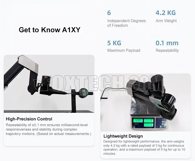 Lightweight & Powerful – Only 4.2 kg arm weight with up to 5 kg maximum payload (3 kg continuous at 0.6 m reach).