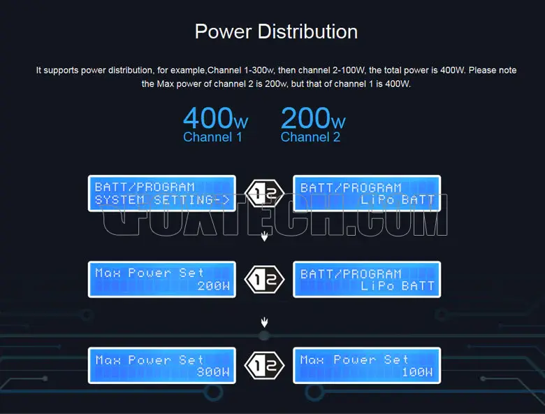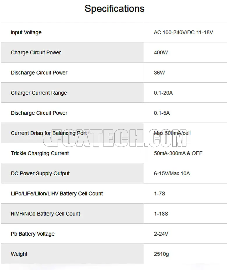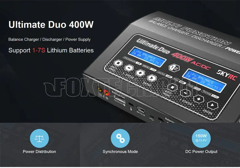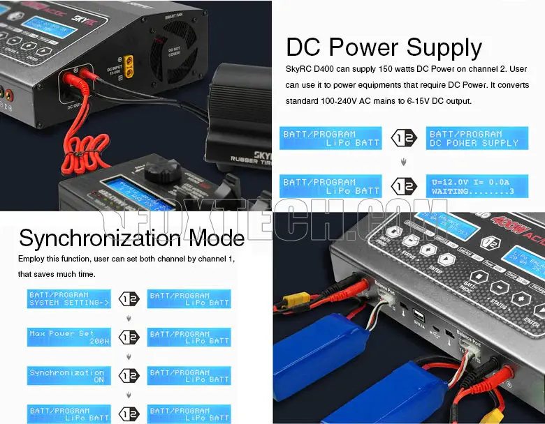SKYRC D400 balance charger is a dual-channel charger with two independent circuits that can charge two different kinds of batteries simultaneously. It supports power distribution in both AC and DC modes to get max charging power and shortens charging time. It is not just a charger, but also a power supply which gives maximum 150W DC power on channel 2 for users to power their DC devices. What’s more, the synchronization mode is available, in which users could perform synchronous settings for charging two same batteries simultaneously to offer time-saving benefits.