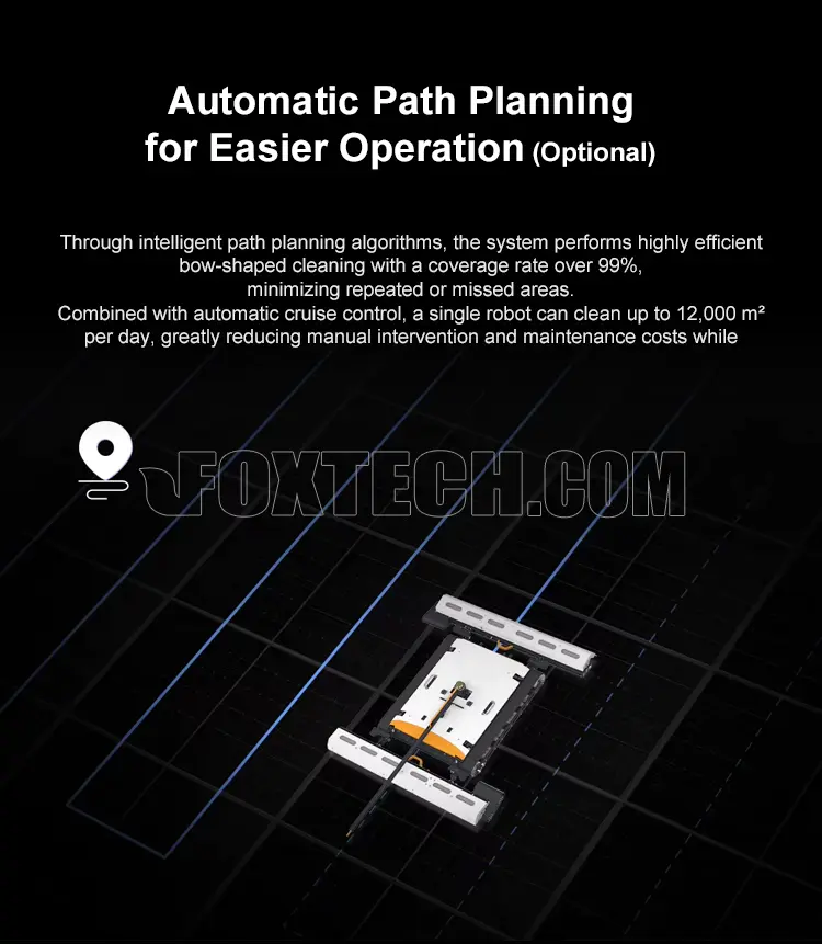 It automatically corrects deviations, avoids overlap, and can clean up to 12,000 m² per day, significantly reducing manual supervision and maximizing power generation efficiency.