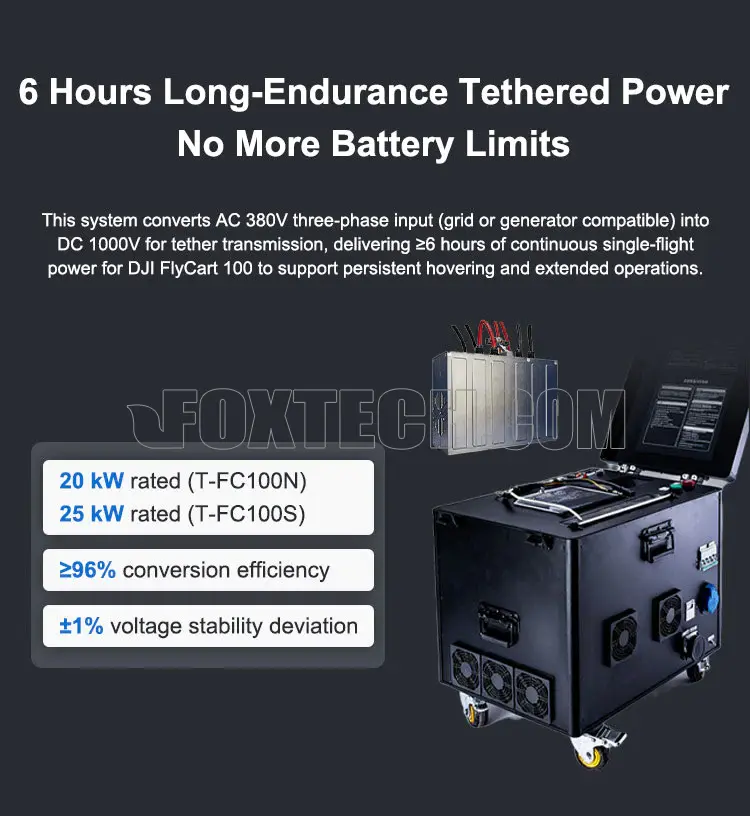 T-FC100N and T-FC100S are two tethered power solutions purpose-built for DJI FlyCart 100. By taking external AC 380V three-phase power (grid or generator compatible) through a mobile tether station and delivering regulated high-voltage DC transmission to the aircraft, it eliminates battery endurance constraints and enables long-duration, stable-hover, on-station operations. With up to 220 m tether length, the system is ideal for persistent missions such as scientific monitoring, nighttime lighting, aerial relay deployments, and security/event standby tasks.