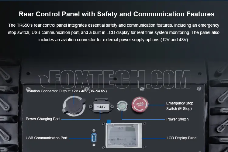 The TR650 features a removable top cover for easy maintenance and upgrades. The control panel integrates an LCD display and an emergency stop button, providing real-time monitoring and safety shutdown in emergencies. The USB plug-and-play communication interface allows users to effortlessly connect to a computer for control and data transfer. Additionally, the TR650 provides 12V and 48V external power outputs, making it compatible with a wide range of external devices.