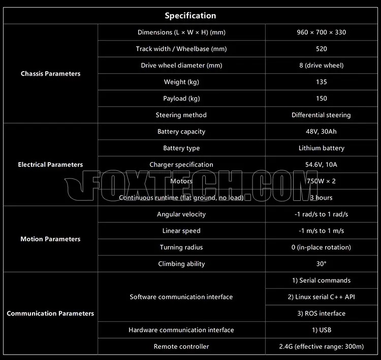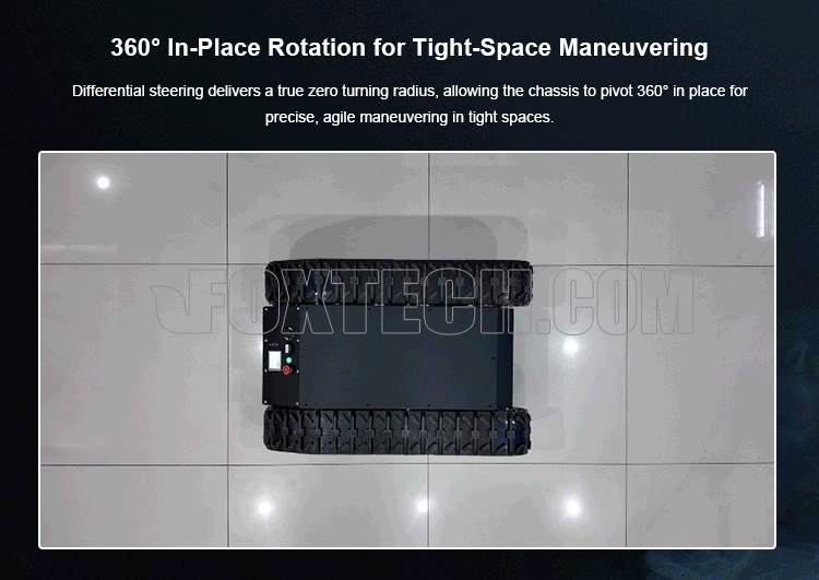 The TR650 is a high-performance tracked robot chassis, featuring a differential drive system designed for various complex terrains. Equipped with 750W*2 servo motors and 10-bit absolute encoders, it delivers strong torque and precise control for stable power output. The 48V 30Ah lithium battery ensures continuous power support, ideal for long-lasting operation and high load requirements. With its Christie suspension system, the TR650 offers enhanced passability, allowing it to easily navigate both sloped indoor environments and complex outdoor surfaces.