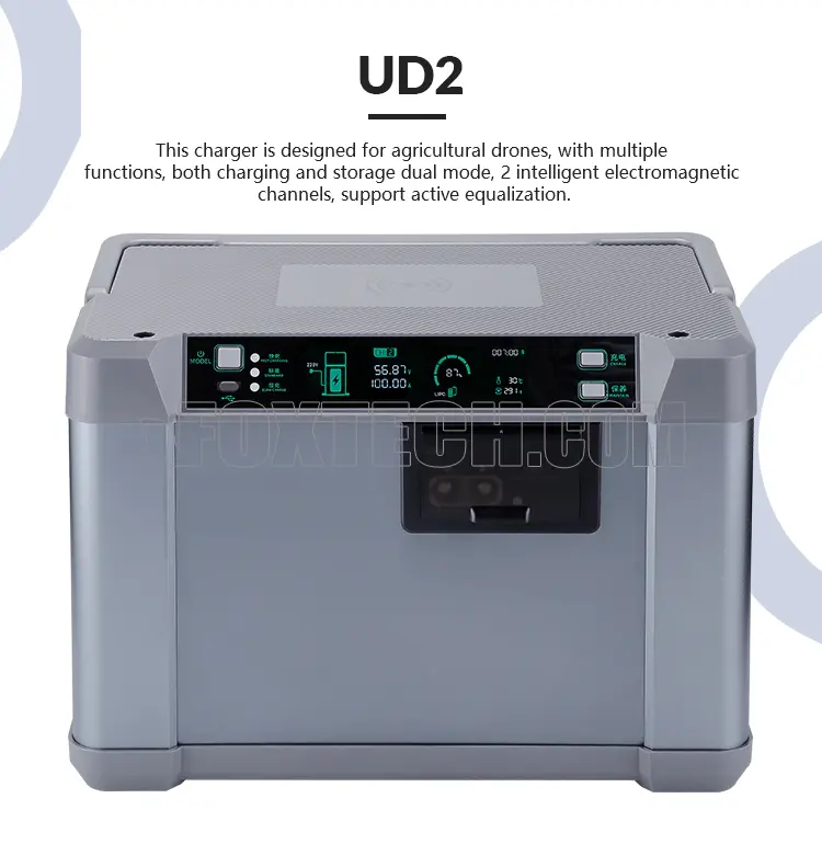 UD2 is an industry-grade fast charger designed for agricultural drones and other large-capacity packs. It provides Charge and Storage dual modes and two intelligent channels, delivering up to 3000W total output and 50A maximum charge current. With active equalization (±20mV), automatic battery identification, Bluetooth remote control, voice announcement, and a clear, intuitive display, UD2 shortens turnaround time and improves charging safety. A wireless phone charging pad on top and dust/splash-proof charge-port plugs add everyday convenience in the field.