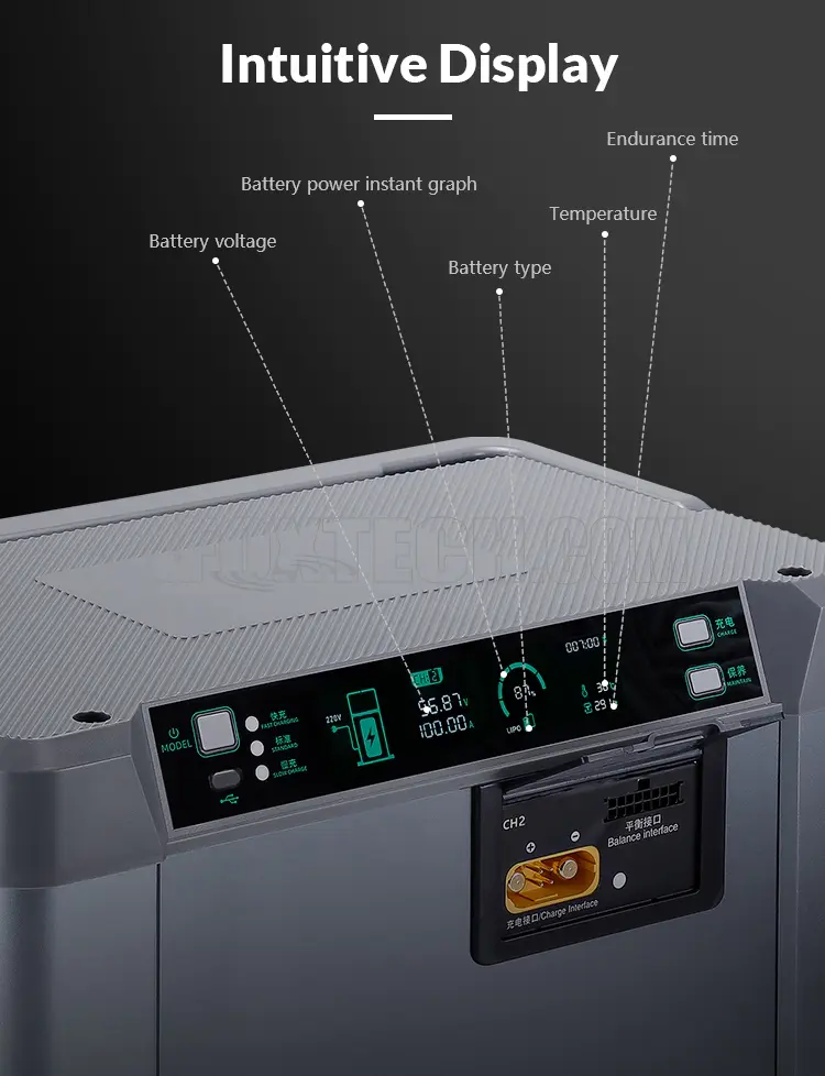 Dual intelligent channels – connect and manage two packs simultaneously; 14–23S compatible