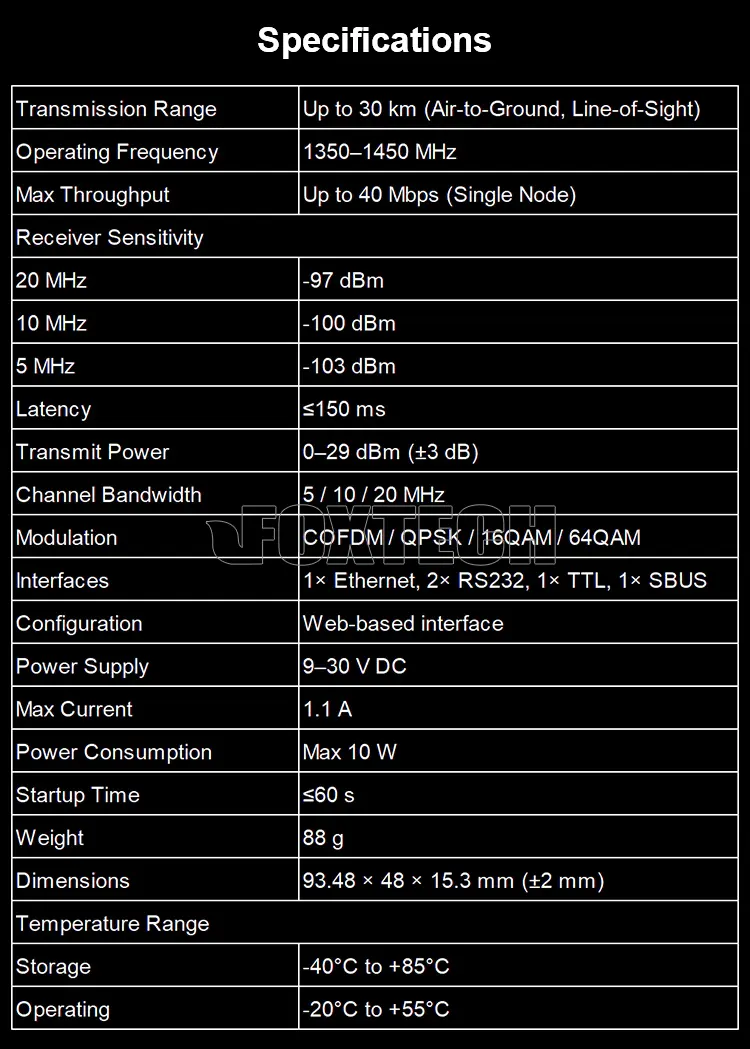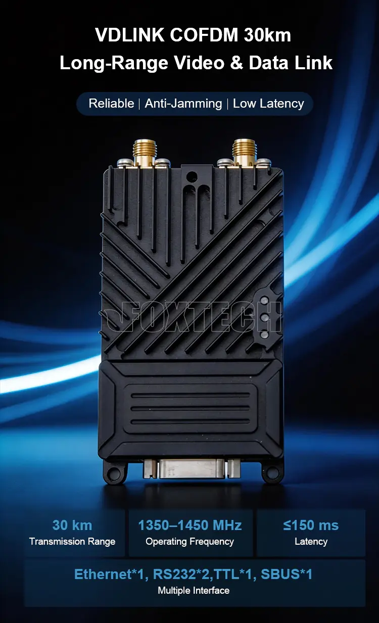 Built with a J30 interface and supporting Layer 2 transparent transmission, the VDLINK COFDM module enables seamless integration with various systems. It supports multiple communication modes, including TCP, UDP, serial-to-serial, and serial-to-IP, making it ideal for flexible deployment across industrial and UAV applications.