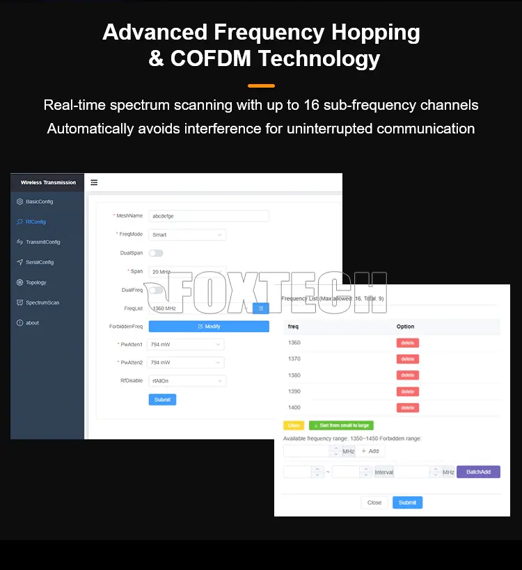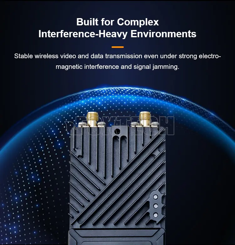 Featuring advanced frequency hopping (FHSS/COFDM) technology, the system supports up to 16 preset sub-frequency channels and performs real-time spectrum scanning to automatically avoid interference, ensuring stable transmission even in the presence of signal jammers.